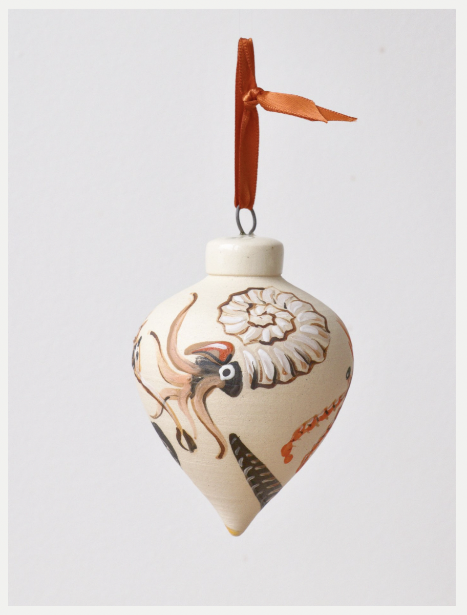 This handmade, wheel-thrown ornament is hand-painted with gorgeous ammonites, trilobites, and other extinct marine cuties.