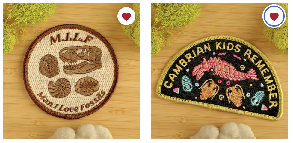 These iron-on patches would be very cute additions to a jean jacket or backpack for anybody wanting to signal their affinity for fossils. I especially love the colors in the Cambrian Kids patch.